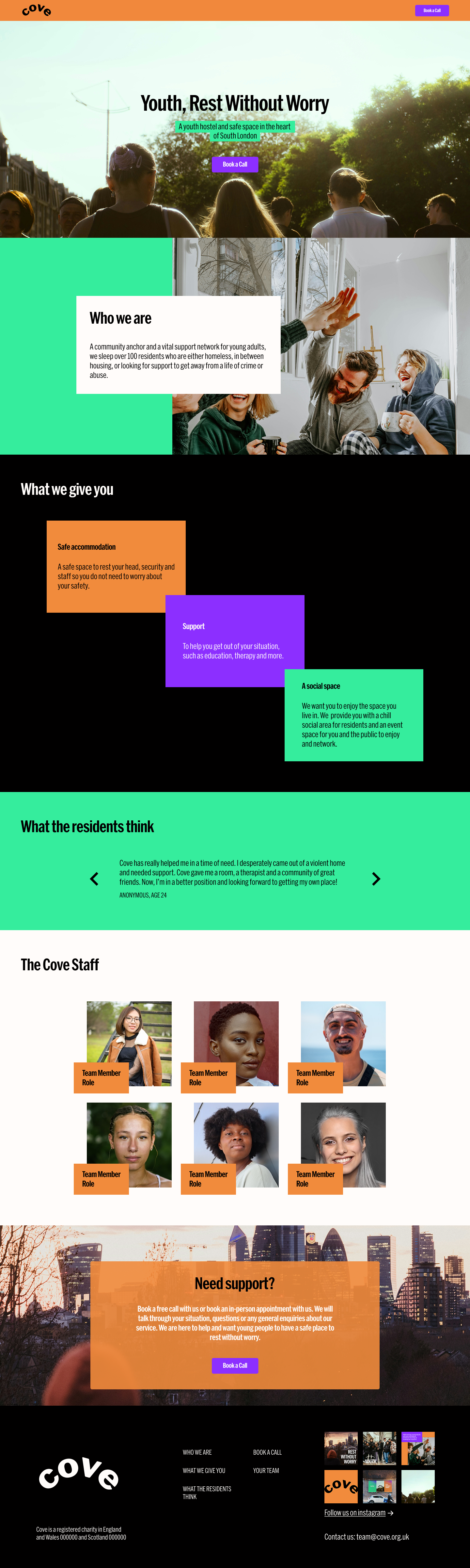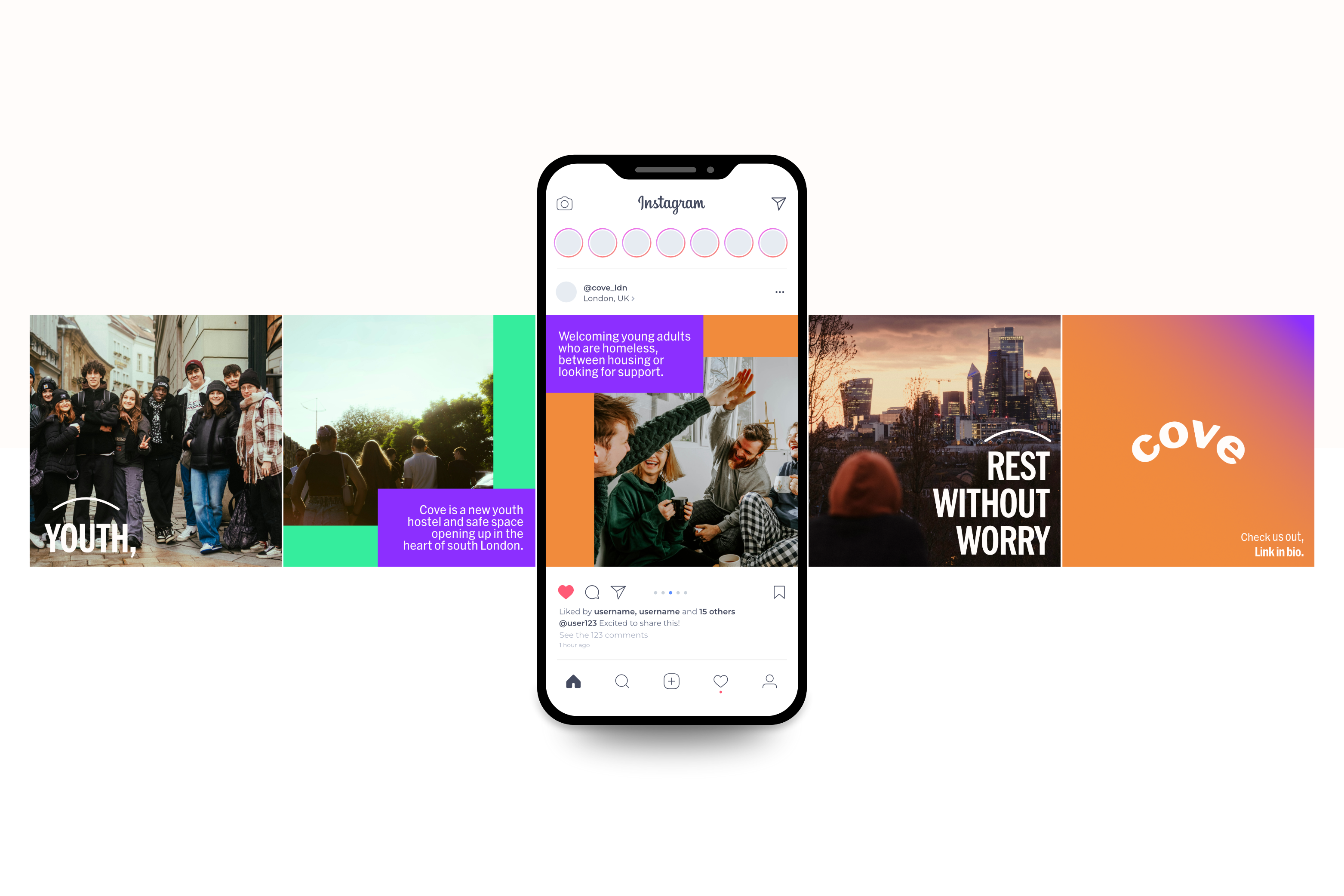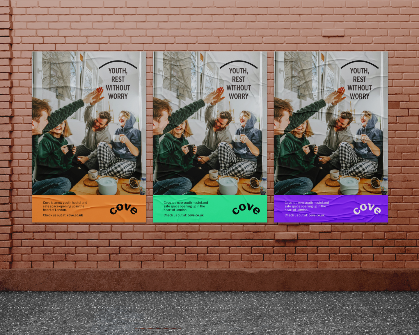 Cove is a youth hostel with the mission to house over 100 youth safely. They wanted to create an eye-catching and disruptive brand identity for campaigns that are consistent, memorable, and impactful.